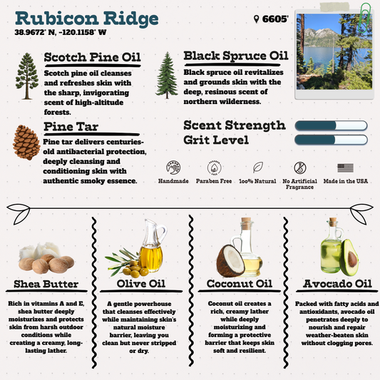 Every Wild Timber soap bar captures the essence of a real place we've explored, from rugged mountain peaks to desert canyons. Made with only natural ingredients and zero synthetic fragrances, these bars are perfect for sensitive skin without sacrificing cleaning power. Because real soap made right doesn't need to choose between gentle and effective. Choose your wild.