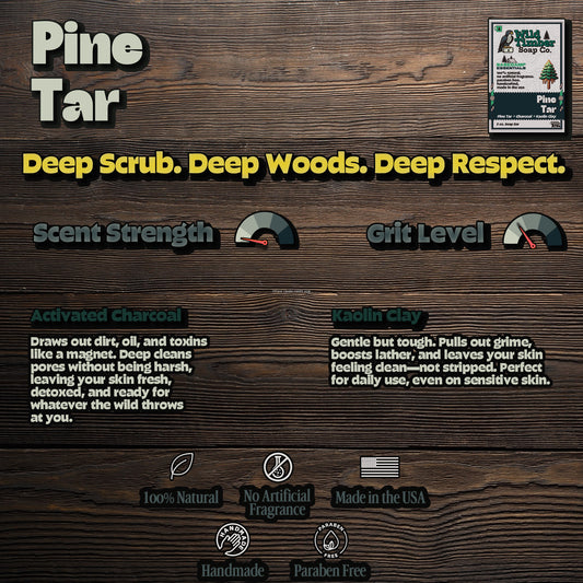 Built for grit, crafted for greatness—our bar soaps are loaded with rugged ingredients like pine tar, charcoal, kaolin clay, and essential oils to clean deep and leave your skin feeling strong, not stripped. Each bar is hand-poured, naturally scented, and designed to outlast weak-sauce body wash. Whether you’re fresh off the trail or just need to wash off the workday, these bars have your back.