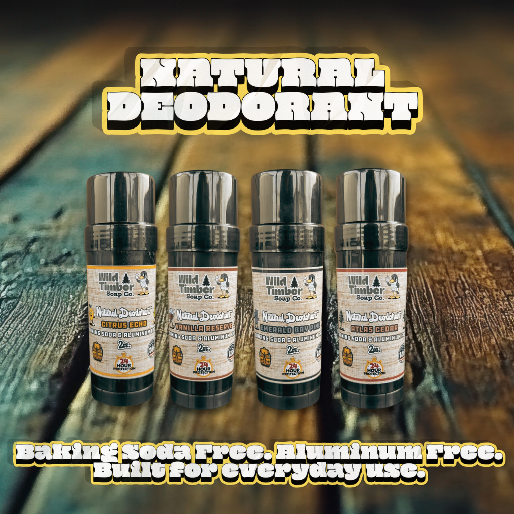 Wild Timber Natural Deodorant delivers dependable odor control using a baking soda–free, aluminum-free formula designed for comfort and daily wear. It goes on smooth, absorbs cleanly, and won’t leave your skin burning, itchy, or overly dry.