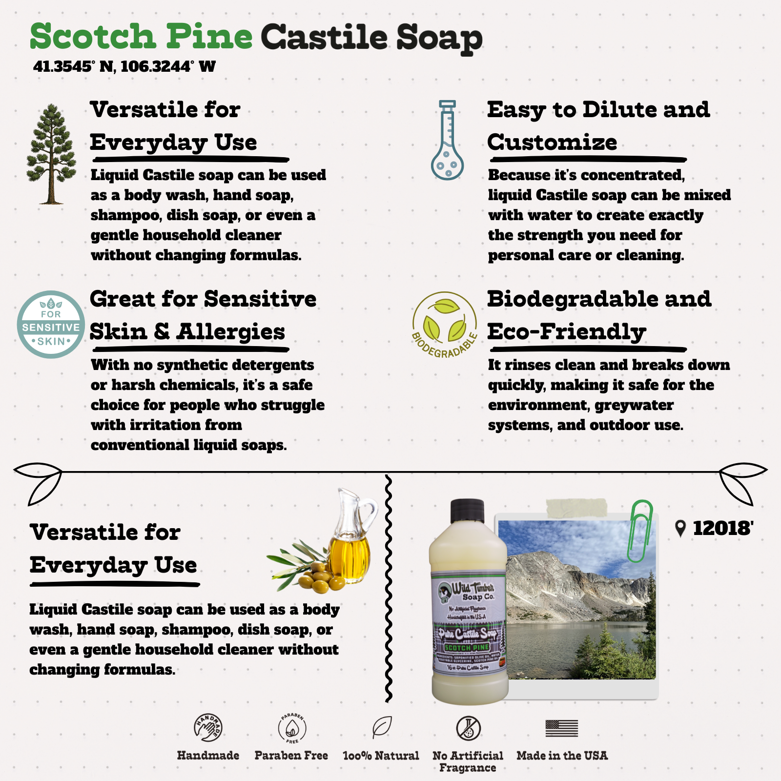 Bring the wild ridgelines of Medicine Bow Peak into your daily routine with our Scotch Pine Natural Castile Soap. Crafted with real essential oils and a clean, vegan formula, this soap captures the sharp, resin-rich scent of high-altitude pine forests. Its plant-based oils create a rich, gentle lather that cleans without stripping your skin, making it perfect for hands, showers, and even natural home cleaning. Biodegradable, eco-friendly, and crafted in small batches, this is the easiest way to bring a rugged alpine clean into everyday life.